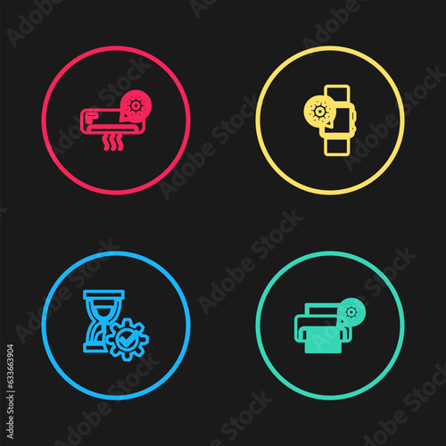 Set line Hourglass setting, Printer, Smartwatch and Air conditioner icon. Vector