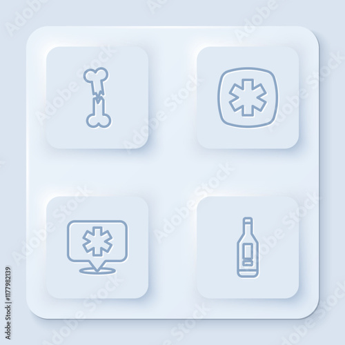 Set line Human broken bone, Emergency - Star of Life, Location hospital and Digital thermometer. White square button. Vector