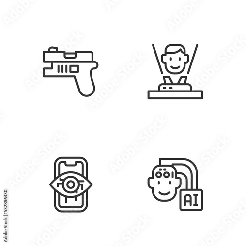 Set line Humanoid robot, Computer vision, Futuristic weapon and Hologram icon. Vector