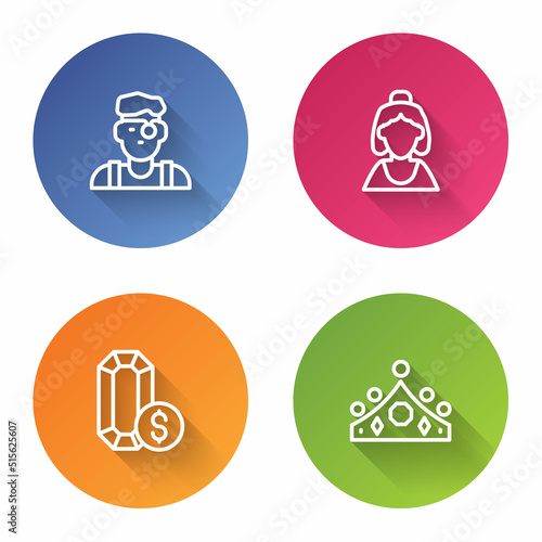Set line Jeweler man, Consultant of jewelry store, Jewelry online shopping and King crown. Color circle button. Vector