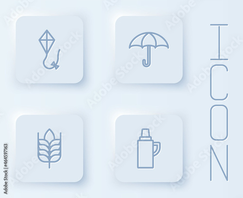 Set line Kite, Umbrella, Wheat and Thermos container. White square button. Vector