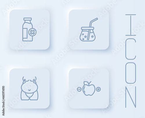 Set line Lactose intolerance, Fresh smoothie, Obesity and Calorie calculator. White square button. Vector