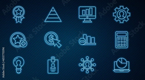 Set line Laptop with graph chart, Calculator, Monitor, Cursor and coin, Star, Medal star, Pie infographic and Pyramid infographics icon. Vector