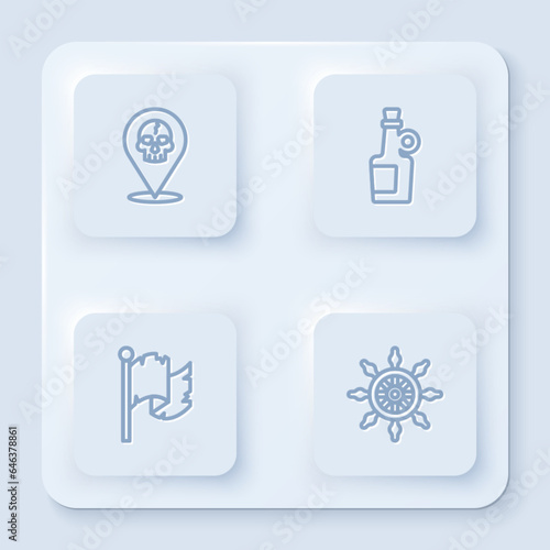 Set line Location pirate, Alcohol drink Rum, Pirate flag and Ship steering wheel. White square button. Vector