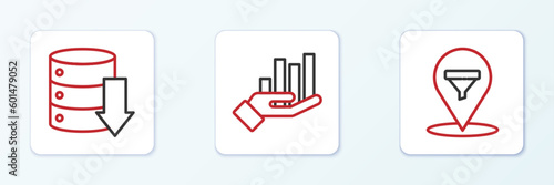Set line Location with sales funnel, Server, Data, Web Hosting and Pie chart infographic icon. Vector