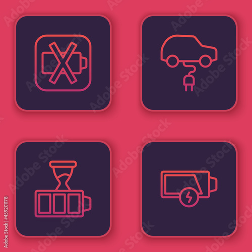 Set line Low battery, Battery charge, Electric car and . Blue square button. Vector
