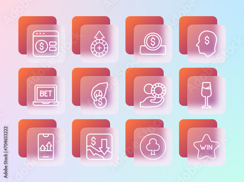 Set line Lucky player, Financial growth decrease, Hand holding casino chips, Playing card with clubs symbol, Coin money dollar, Online poker table game and Casino icon. Vector