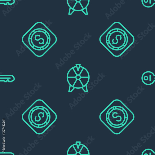 Set line Lucky wheel, Coin money with dollar and Old key on seamless pattern. Vector