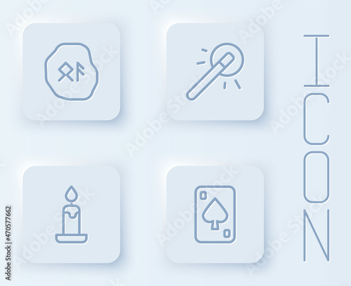 Set line Magic runes, wand, Burning candle and Playing cards. White square button. Vector