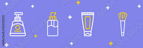 Set line Makeup brush, Cream or lotion cosmetic tube, Bottle of liquid soap and icon. Vector
