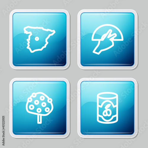 Set line Map of Spain, Fan flamenco, Orange tree and Olives can icon. Vector
