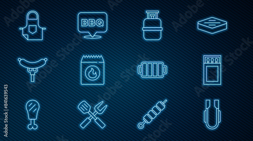 Set line Meat tongs, Matchbox and matches, Propane gas tank, Barbecue coal bag, Sausage the fork, Kitchen apron, grill and icon. Vector