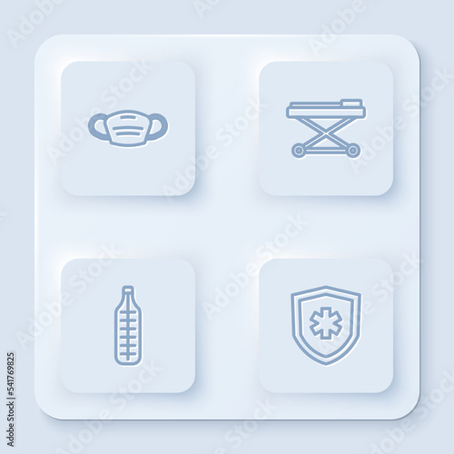 Set line Medical protective mask, Stretcher, thermometer and Life insurance. White square button. Vector