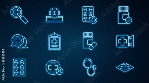 Set line Medicine pill or tablet, Medical clipboard with clinical record, Dialogue the doctor, Magnifying glass for search medical, bottle and pills and Otolaryngological head reflector icon. Vector