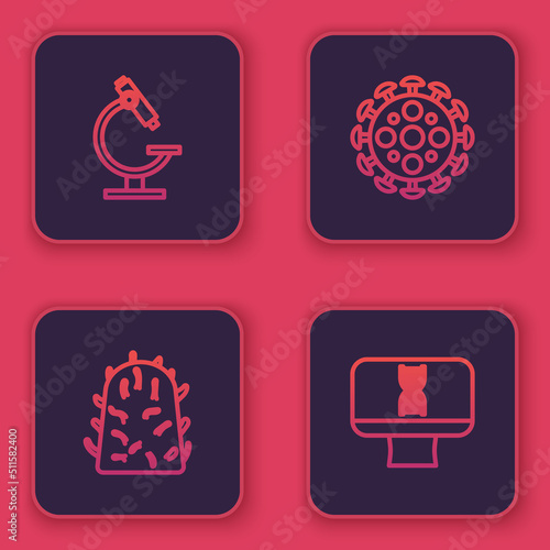 Set line Microscope, Rabies virus, Virus and DNA spiral and computer. Blue square button. Vector