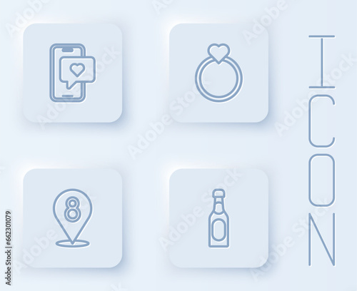 Set line Mobile with heart, Diamond engagement ring, 8 March and Champagne bottle. White square button. Vector