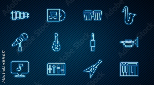 Set line Music synthesizer, Trumpet, Drum, Guitar, Microphone, Xylophone, Audio jack and Vinyl disk icon. Vector