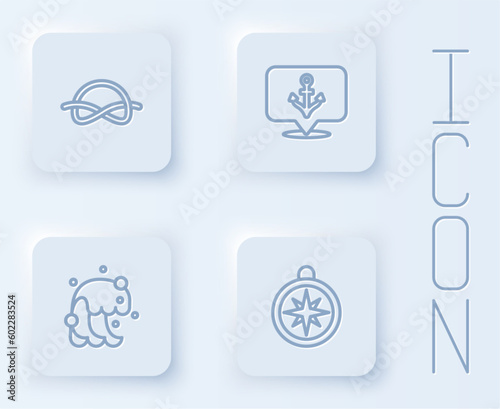 Set line Nautical rope knots, Anchor, Tsunami and Compass. White square button. Vector