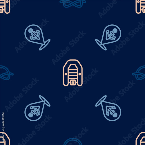 Set line Nautical rope knots, Location with anchor and Inflatable boat motor on seamless pattern. Vector