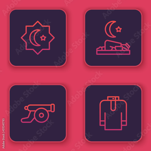 Set line Octagonal star, Ramadan cannon, Muslim man prays and Shirt kurta. Blue square button. Vector
