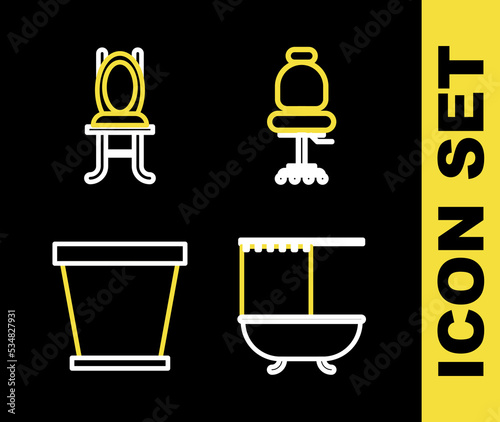 Set line Office chair, Bathtub with shower curtain, Flower pot and Chair icon. Vector