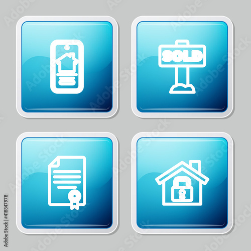 Set line Online real estate house, Hanging sign with text Sold, House contract and under protection icon. Vector.