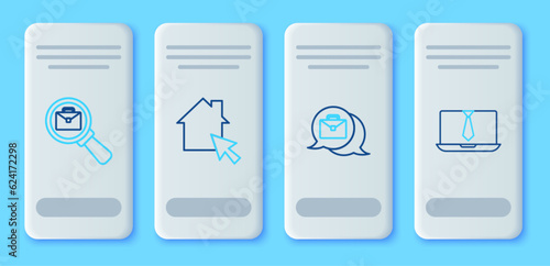 Set line Online working, Magnifying glass with briefcase and Video chat conference icon. Vector
