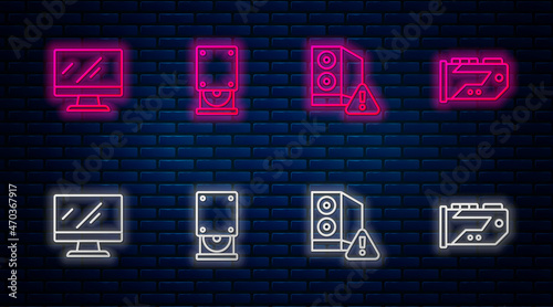Set line Optical disc drive, Case of computer, Computer monitor screen and Video graphic card. Glowing neon icon on brick wall. Vector