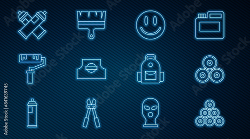 Set line Paint spray can, Smile face, Spray nozzle cap, roller brush, School backpack and icon. Vector
