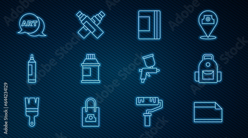 Set line Paper adhesive sticker, School backpack, Spiral notebook, Paint, gouache, jar, dye, Marker pen, Speech bubble with text art, spray gun and icon. Vector