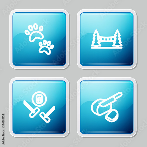 Set line Paw print, Capilano Suspension Bridge, Curling sport game and Peameal bacon icon. Vector.