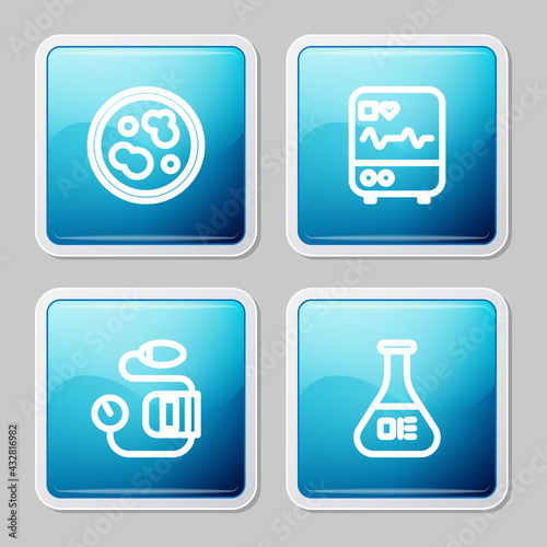 Set line Petri dish with bacteria, Monitor cardiogram, Blood pressure and Test tube and flask icon. Vector