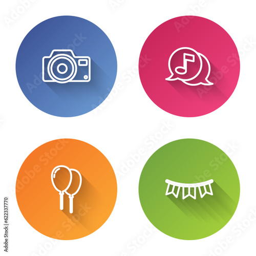 Set line Photo camera, Musical note in speech bubble, Balloons with ribbon and Carnival garland flags. Color circle button. Vector