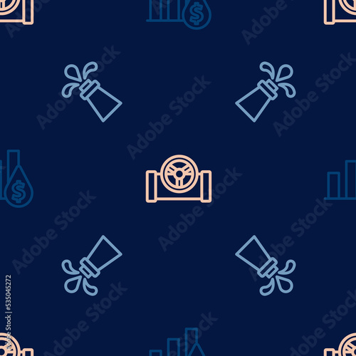 Set line Pie chart and dollar, Oil rig and pipe with valve on seamless pattern. Vector