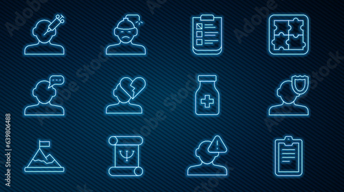 Set line Psychological test, Psychology, Broken heart or divorce, Online psychological counseling, Addiction to the drug, Sedative pills and Concussion, headache icon. Vector