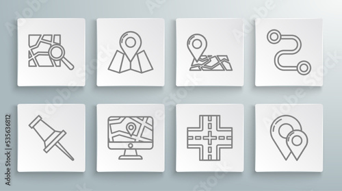 Set line Push pin, Folded map with location marker, Monitor and folded, Road traffic sign, Map, Route and icon. Vector