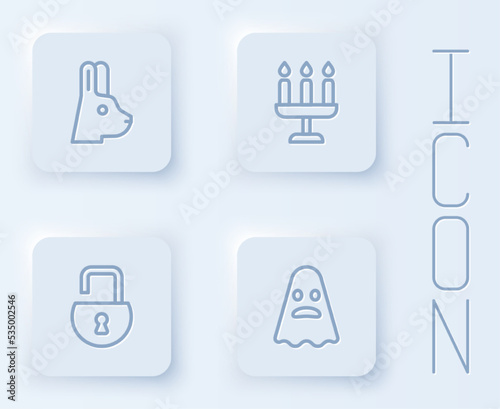 Set line Rabbit with ears, Candlestick, Open padlock and Ghost. White square button. Vector