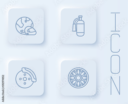 Set line Racing helmet, Fire extinguisher, Car brake disk with caliper and Alloy wheel for car. White square button. Vector