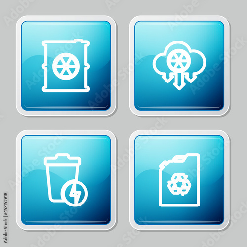 Set line Radioactive waste in barrel, Acid rain and radioactive cloud, Lightning with trash can and Eco fuel canister icon. Vector
