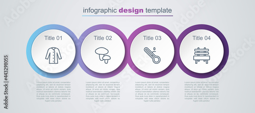 Set line Raincoat, Mushroom, Meteorology thermometer and Bench. Business infographic template. Vector