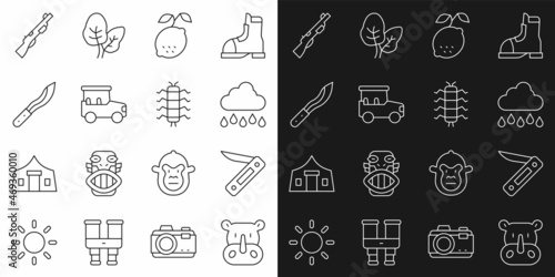 Set line Rhinoceros, Swiss army knife, Cloud with rain, Lemon, Safari car, Machete, Hunting gun and Centipede insect icon. Vector