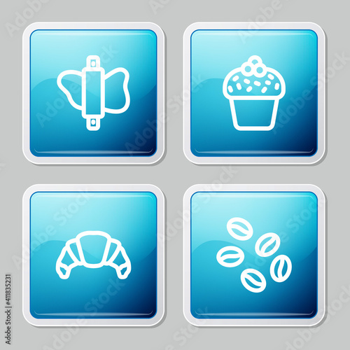 Set line Rolling pin on dough, Cake, Croissant and Coffee beans icon. Vector.
