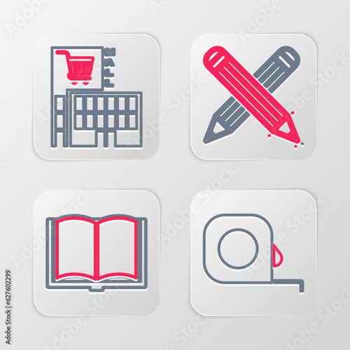 Set line Roulette construction, Open book, Crossed pencil and Mall or supermarket building icon. Vector