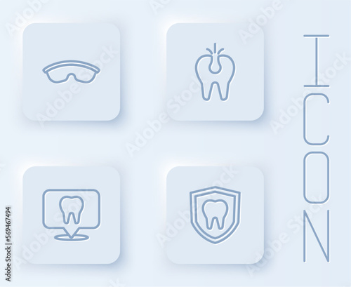 Set line Safety goggle glasses, Broken tooth, Dental clinic location and protection. White square button. Vector