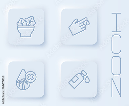 Set line Salad in bowl, Finger blood, Palm oil free and Bottle of water. White square button. Vector