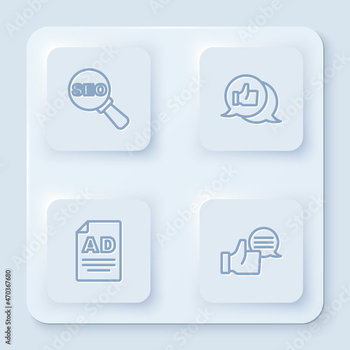 Set line SEO optimization, Customer product rating, Advertising and . White square button. Vector
