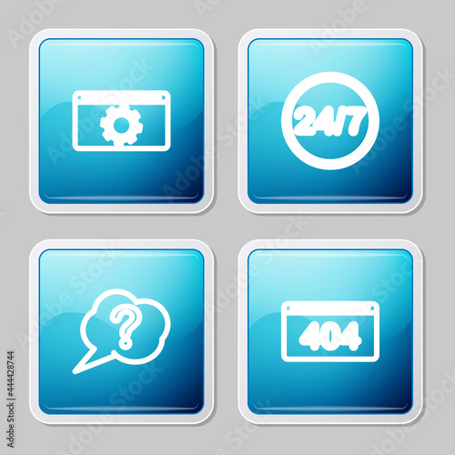 Set line Setting, Clock 24 hours, Speech bubble Question and Page with a 404 error icon. Vector