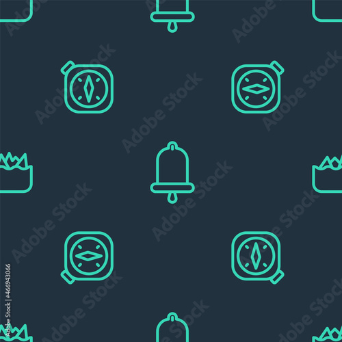 Set line Ship bell, Compass and Sharp stone reefs on seamless pattern. Vector