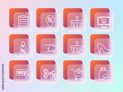 Set line Shopping cart on monitor, Scissors cuts discount coupon, Add basket, Location with cardboard box, Clipboard checklist and percent icon. Vector