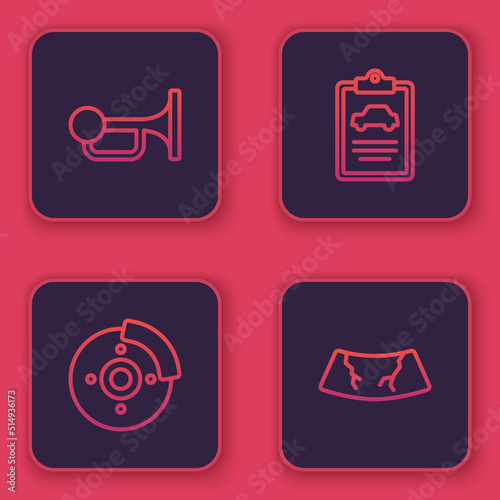Set line Signal horn on vehicle, Car brake disk with caliper, inspection and Broken windshield. Blue square button. Vector
